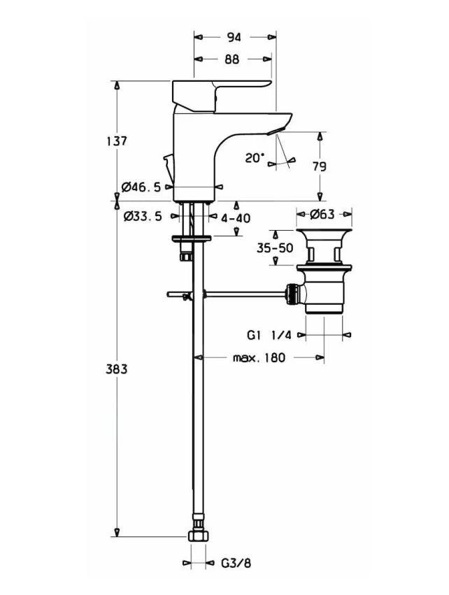 - afvoergarnituur (metaal) en bediening met trekhendel